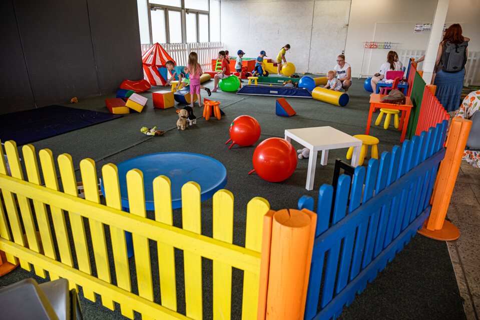 skákací hrady, krytý dětský koutek v přízemí tribuny.