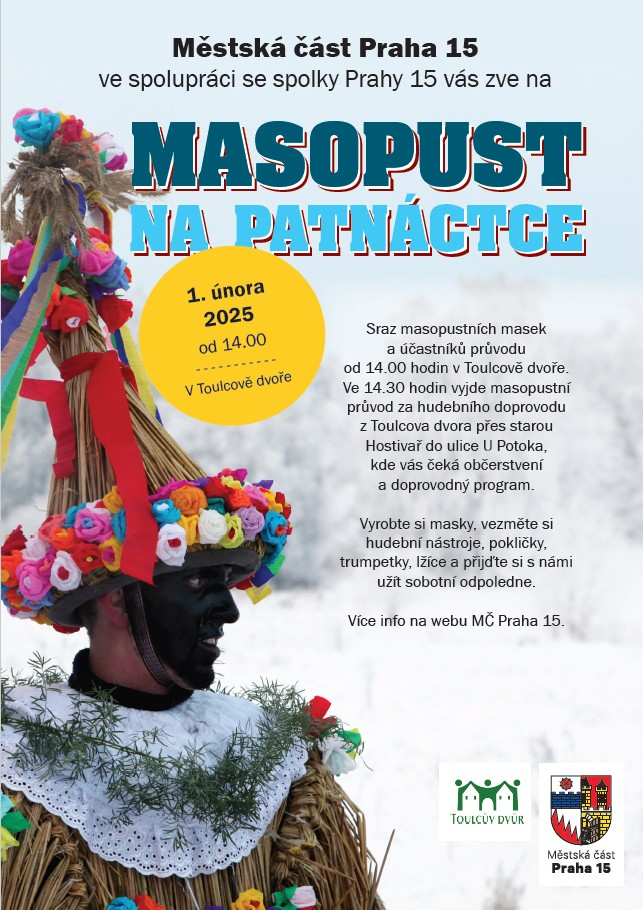 Sraz masopustních masek od 14.00 hodin v Toulcově dvoře. Ve 14.30 vyjde masopustní průvod za hudebního doprovodu z Toulcova dvora přes starou Hostivař do ulice U Potoka, kde vás bude čekat občerstvení a doprovodný program.