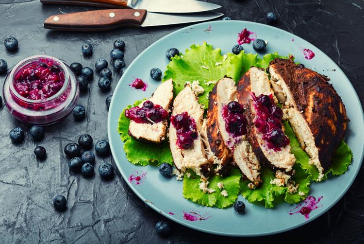 Grilovaný filet z lososa s borůvkovým glazéa zeleninovou quinou, mátový přeliv