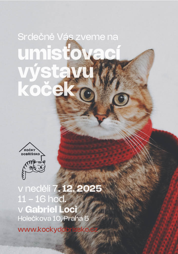 Umísťovací výstava koček se koná v neděli 7. prosince 2025 od 11 do 16 hodin v objektu Gabriel Loci, v bývalém klášteře sv. Gabriela.