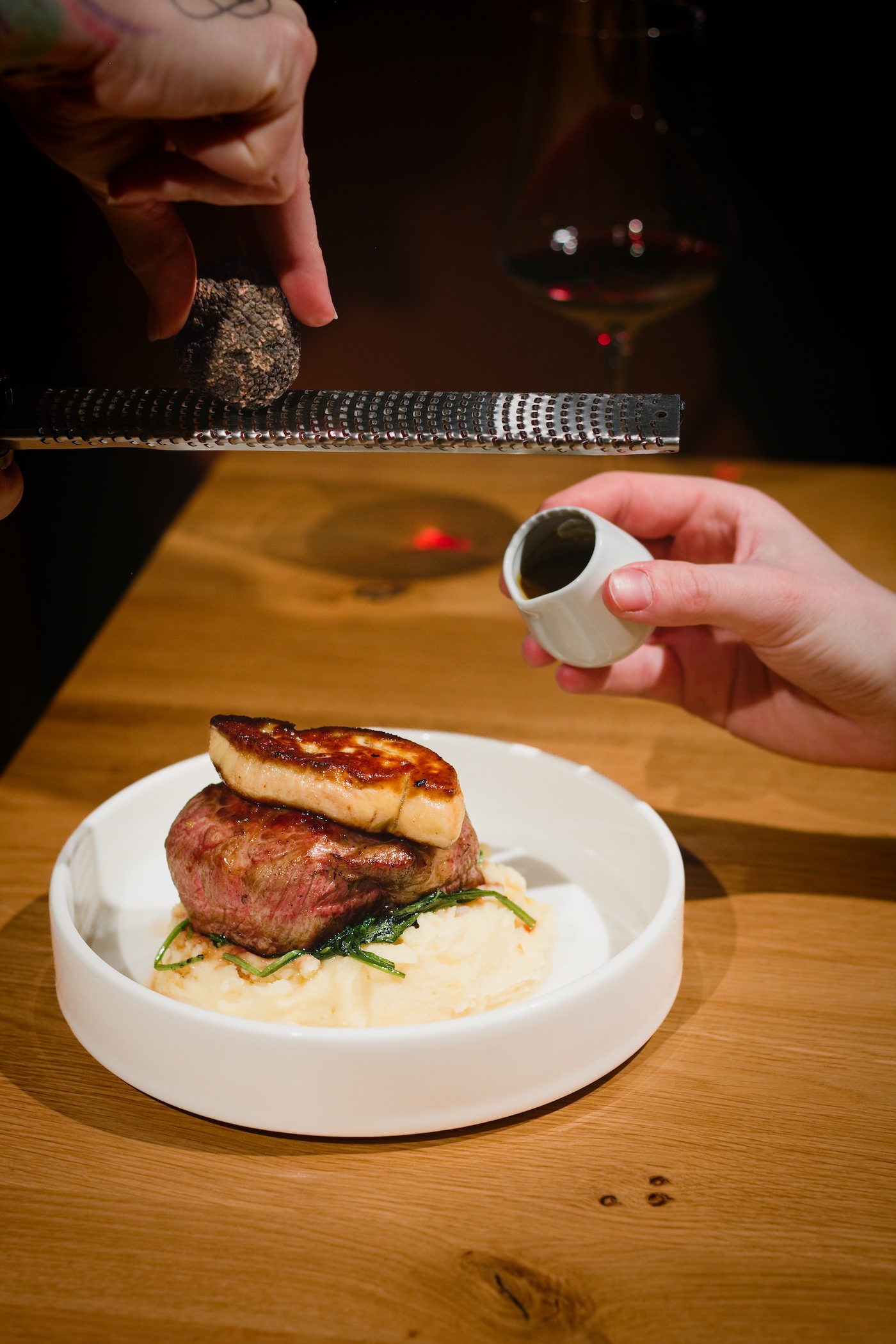 hovězí svíčková, foie gras, čerstvý lanýž, bramborová kaše, silná omáčka, špenát