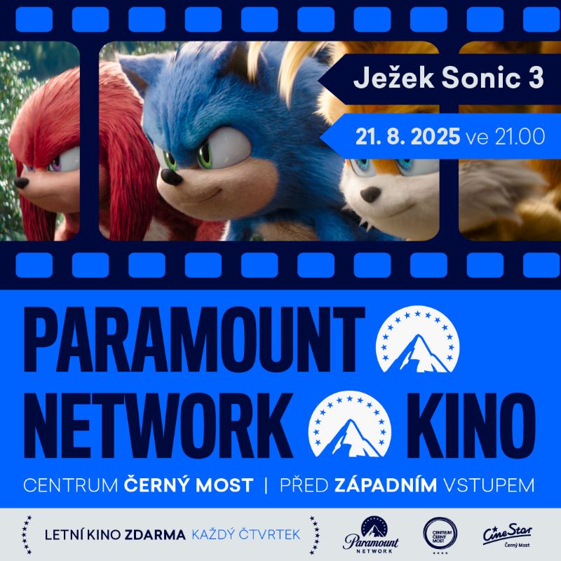 K létu patří neodmyslitelně i filmy pod hvězdnou oblohou. Užít si je můžete zadarmo v Paramount Network Kině u Centra Černý Most v Praze! Ve čtvrtek 21. srpna potěší malé i velké ve 21.00 hodin Ježek Sonic 3.