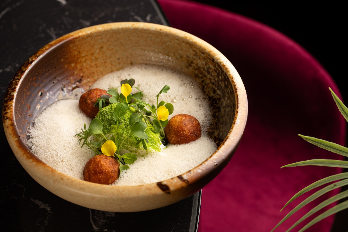 Máte-li chuť na vejce v křupavém bylinkovém obalu, doplněné pestem z medvědího česneku, krokety z iberica a nadýchanou