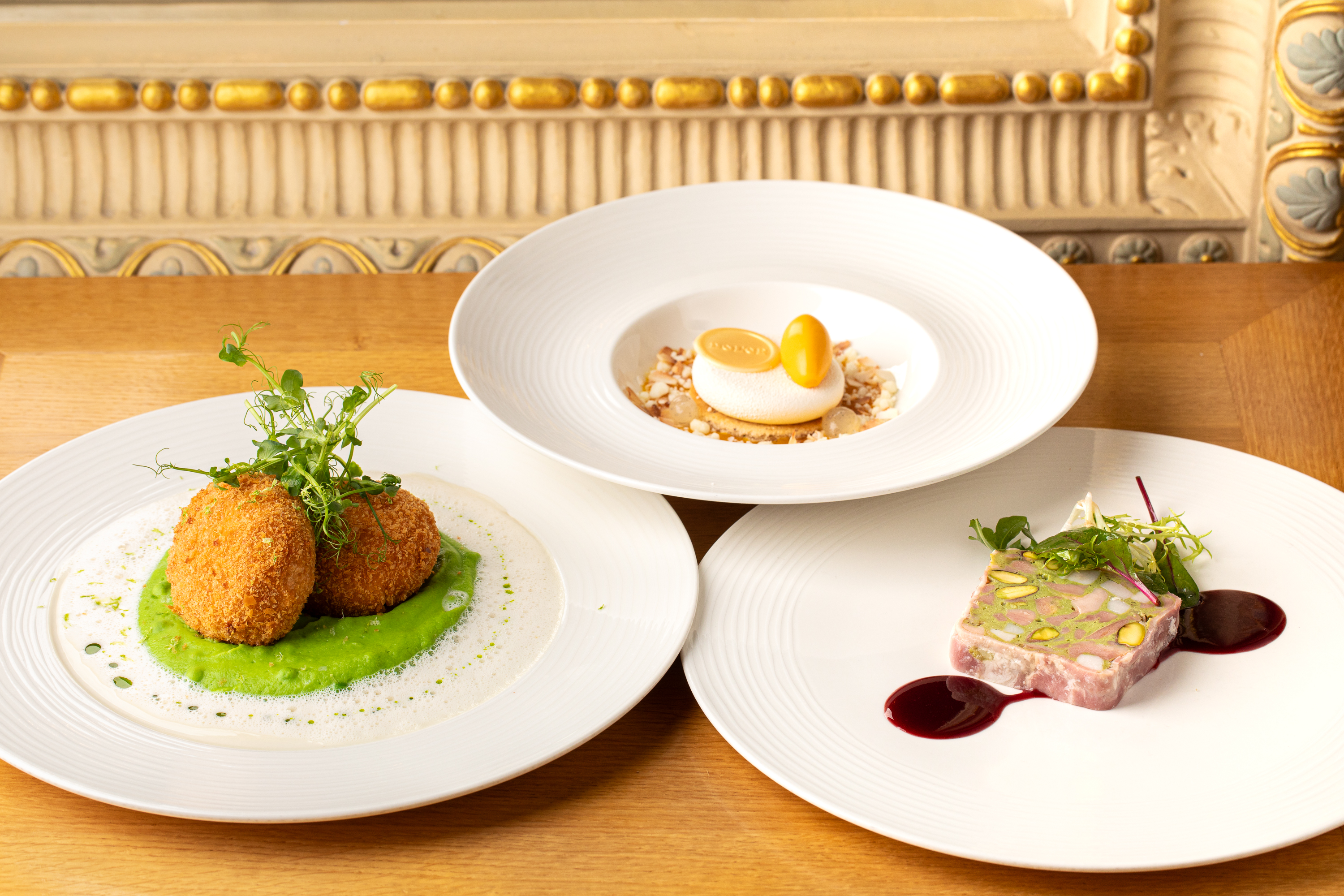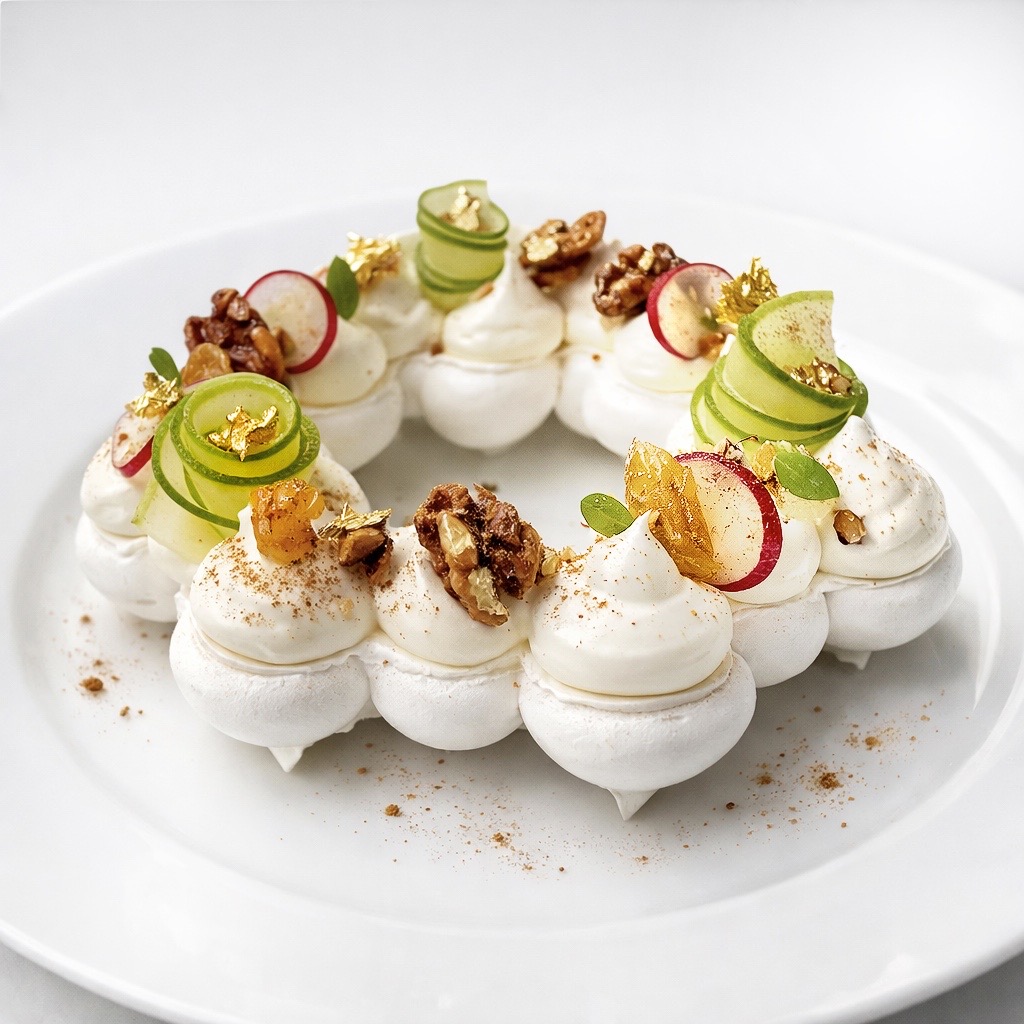 Sněhové pusinky se zeleným jablkem, rozinkami, karamelizovanými ořechy a jedlým zlatem můžete zakusit v Alchymist Restaurant.