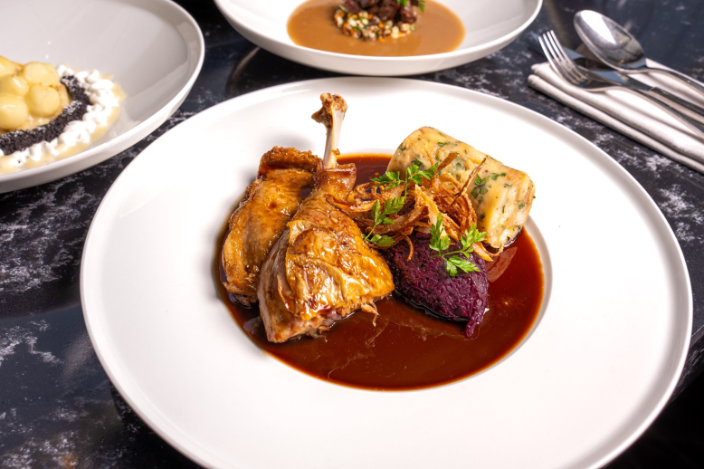 - Konfitované husí stehno – s karamelizovaným červeným zelím a bramborovým knedlíkem s křupavou cibulkou