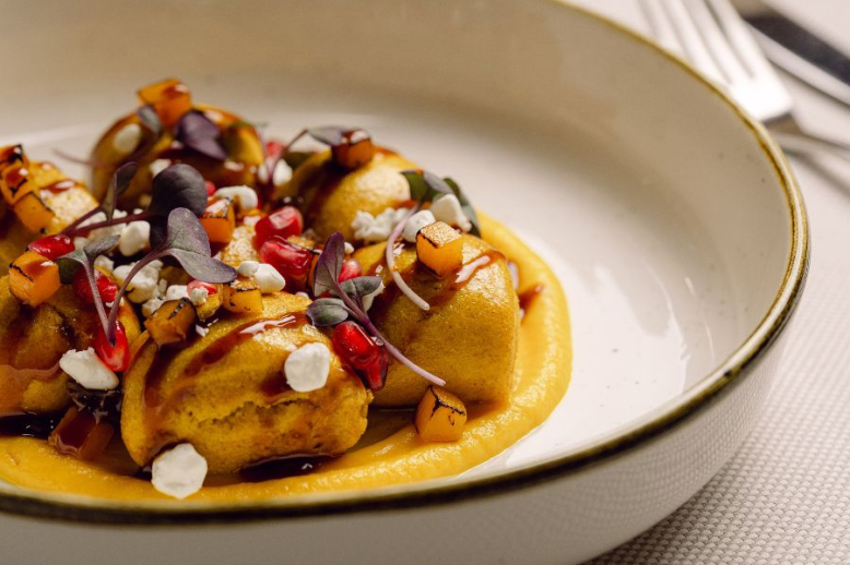 V předkrmech se objevují sezónní suroviny v lehčím, hravějším pojetí – například grilovaná dýně Hokkaido s bylinkami a černým česnekem, polévky založené na kysaném zelí a kořenové zelenině nebo oblíbený fishcake, tentokrát z candáta. Hlavní chody pak přinášejí kombinace, které jsou na první pohled „české“, ale překvapí detaily: například kachna s červeným zelím se podává s hruškou marinovanou v koření, telecí řízek doprovází jablečno–telecí omáčka a bramborová kaše s hnědým máslem.