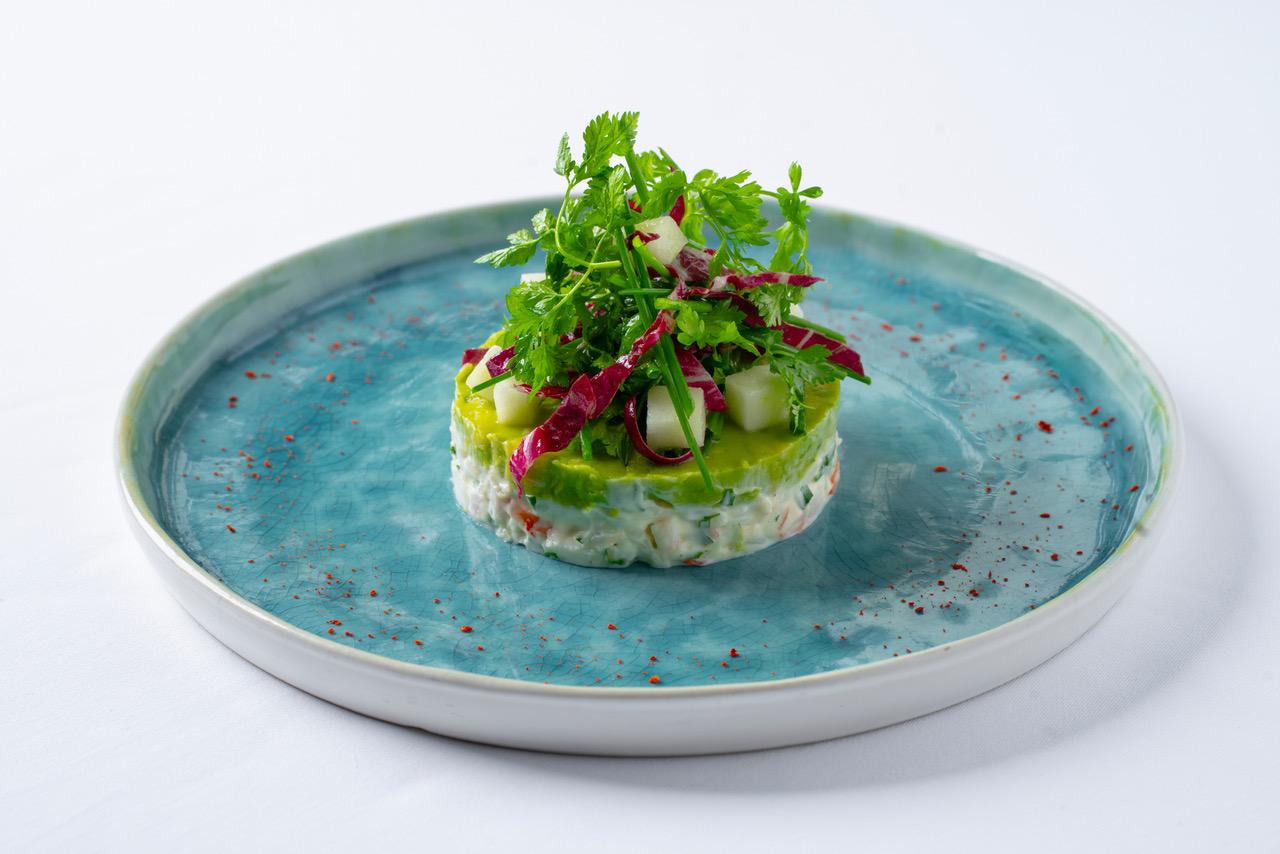 Avokádový timbál s rajčaty, koriandrem, jalapeños, chili drezinkem a pohankou