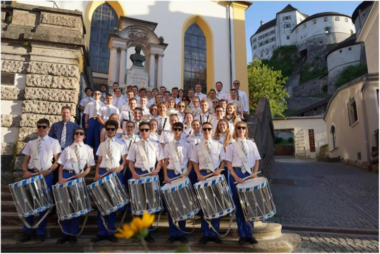 Živé vystoupení švýcarského dechového a bubenického souboru Jugendmusik Zürich 11 na Kampě.