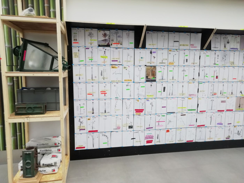 Základním instalačním prvkem jsou střešní latě, které tvoří nosnou i vizuální strukturu výstavy a které jsou použity v surovém stavu bez dodatečných povrchových úprav. Tím je zdůrazněna jejich stavební, pracovní a dočasná povaha. Dalšími prvky instalace jsou materiály pocházející z ateliéru, především komponenty a fragmenty spojené s výrobou lamp a svítidel.