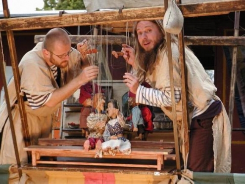 Loutkové představení odehrávající se na komediantském voze.