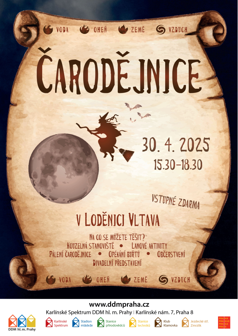 Dne 30.04.2025 od 15:30 do 18:30 se otevřou magické brány Loděnice Vltava. Srdečně zveme všechny mladé čarodějnice a kouzelníky na místo, kde se ponoříte do světa kouzel a kouzelnických praktik. Připravte se na den plný zábavy, kde se můžete stát mistrem kouzel a prozkoumat svět tajemné alchymie. Můžete se těšit na výtvarné dílny, čarodějnické aktivity, ale také můžete ukázat své schopnosti na vysokých lanech. Součástí akce také bude divadelní představení, bohaté občerstvení, opékání buřtů a samozřejmě i upálení čarodějnice. Účast na akci je díky podpoře Prahy zcela zdarma.