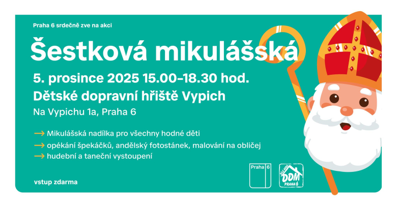 Čeká vás mikulášská nadílka, setkání s čerty a anděly, hudební a taneční vystoupení, opékání špekáčků. Akce se koná v areálu dopravního hřiště DDM na Vypichu.