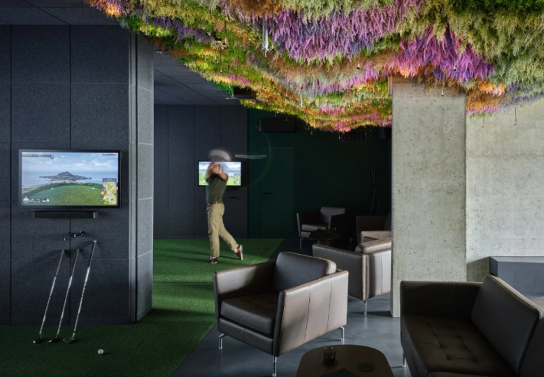 Místnost s vnitřním golfovým simulátorem s velkou obrazovkou zobrazující malebnou krajinu hor a vody, golfový míček na zeleném trávníku v popředí a golfové hole na stojanech vpravo. Strop je zdoben barevnými sušenými květinami nebo rostlinami.