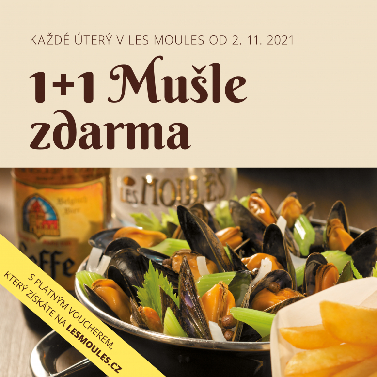 Akce funguje na základě VOUCHERU, který získáte tak, že nám pro REZERVACI svého úterního místa napíšete na email info@lesmoules.cz a my Vám VOUCHER na porci 1+1 zdarma obratem zašleme.