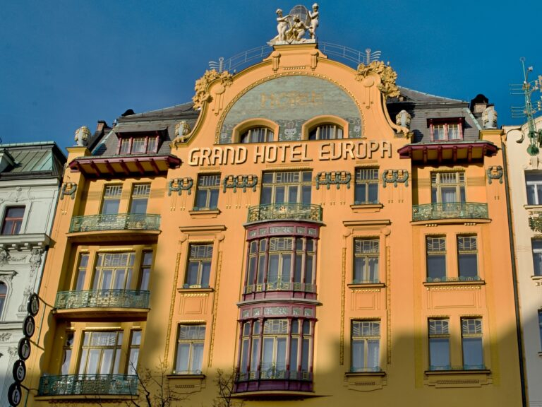 Sraz je před hotelem Evropa u květinového pásu (Václavské náměstí 826/25, Praha 1-Nové Město).