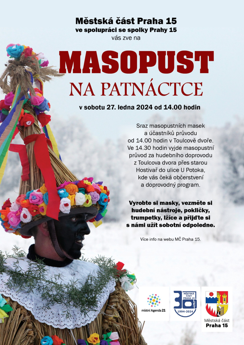 Sraz masopustních masek od 14.00 hodin v Toulcově dvoře. Ve 14.30 vyjde masopustní průvod za hudebního doprovodu z Toulcova dvora přes staropu Hostivař do ulice U Potoka, kde vás bude čekat občerstvení a doprovodný program.