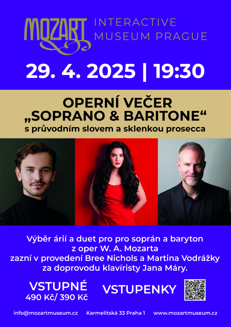 Mozartovo interaktivní muzeum uvádí v rámci řady Fialový salon Mozartovský operní večer „soprano & baritone“ s průvodním slovem a sklenkou prosecca. Výběr árií a duet pro soprán a baryton z oper W. A. Mozarta zazní v provedení Bree Nichols a Martina Vodrážky za doprovodu klavíristy Jana Máry.