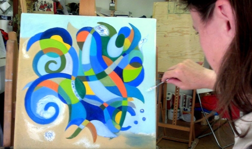 Dalším krokem bude výběr barev, popovídáme si o jejich míchání a vyvažování na obrazové ploše. Dobré je si přinést sluchátka a během tvorby poslouchat hudbu, (mně osobně to velice inspiruje a většina mých abstraktních obrazů vznikla jako přímá reakce na hudbu).