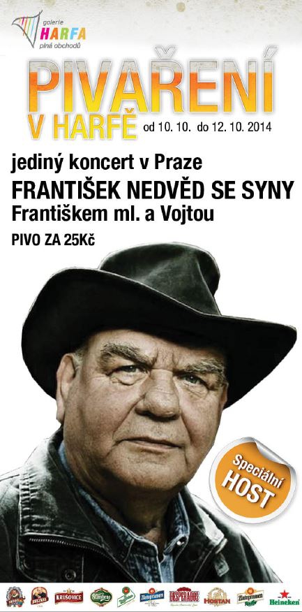 Od 10. do 12. října můžete přijít do Galerie Harfa ochutnávat různé druhy piv. Po celý víkend na vás čeká i Bubenická show a v sobotu 11. října od 16.00 můžete vyslechnout jedinečný koncert Františka Nedvěda a jeho synů Františka ml. a Vojty!