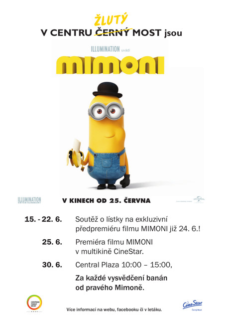 Na sklonku června se chodby Centra Černý Most rozzáří žlutými barvami. Uskuteční se zde totiž exkluzivní předpremiéra nové animované komedie s názvem Mimoni, jejímiž hlavními protagonisty jsou právě žluté sympatické postavičky.