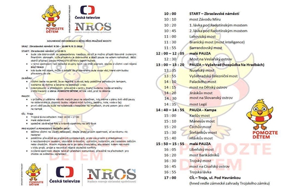srdečně vás zveme na druhý ročník charitativního nezávodního výběhu přes pražské říční mosty. Startujeme v sobotu 6. února 10 hodin ze Zbraslavského náměstí. Pokusili jsme se sestavit časový harmonogram, ve kterém máme tak cca ½ hodinovou skrytou rezervu, takže doufáme, že do 17 hodin doběhne do Troje. Pokud by se chtěl někdo připojit nebo naopak odpojit cestou, berte prosím časy jen orientačně a raději počítejte s nějakou odchylkou.