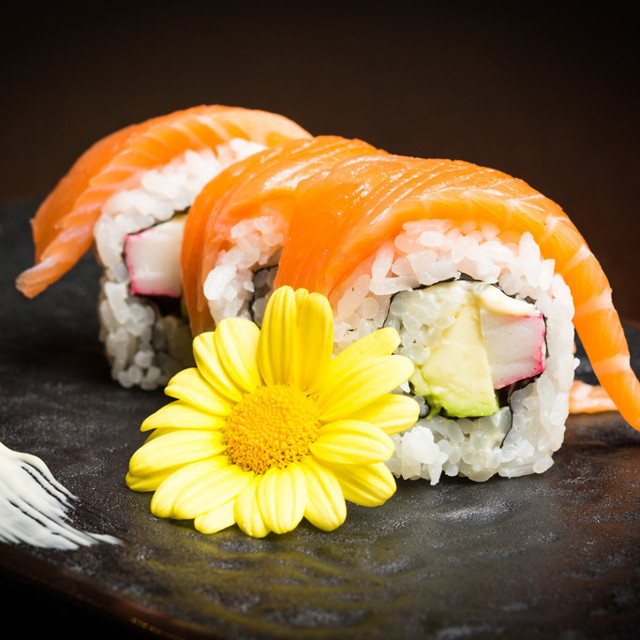 Šéfkuchařův výběr Sashimi, Nigiri, bulgogi rolka, foie gras unagi rolka (tenké plátky syrové ryby, plátky syrové ryby s rýží a korejské hovězí rolky)