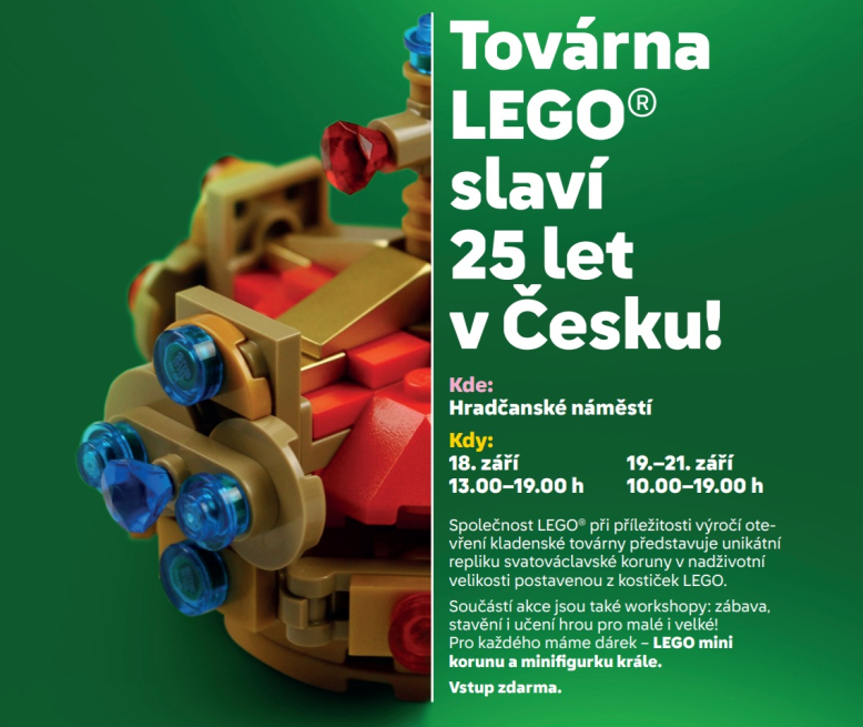 K příležitosti oslavy této události vznikl první unikátní kostičkový model svatováclavské koruny v nadživotní velikosti postavený jen pro Českou republiku, který bude přístupný od 18. do 21. září.
