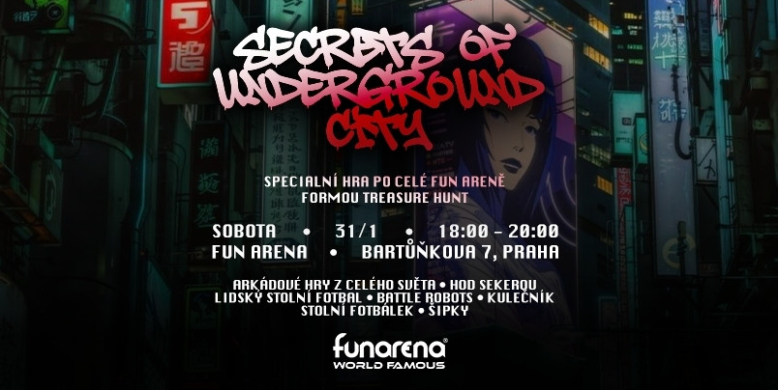 Po velkém zájmu veřejnosti se Fun Arena rozhodla otevřít své sobotní večery široké veřejnosti. V sobotu 31. ledna bude představen nový herní koncept Secrets of Underground City, tentokrát s podtitulem Insider’s Tip, který kombinuje prvky únikové hry a honby za pokladem v unikátním dystopickém cyberpunkovém prostředí.